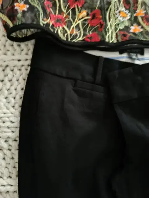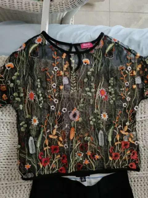 Pantalón negro talla 12petit marca Banana Repúblic. Blusa Sasha talla G translúcida con bordados florales. Acompañalo con sandalias de tacón. Lucirás muy femenina.