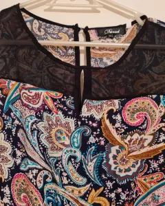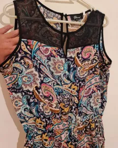 LINDO PALAZZO FRESCO ALGODON!! ESTAMPADO MIL ADORNOS GARIBOLEADOS!! MUY CASUAL Y SENSUAL ADORNO DE TRANPARENCIA NEGRA EN PECHO DE BLUSA/ BOLSAS SIMULADAS/ TALLA : M/L / ANCHO BUSTO: 54CM!! NUEVO!!