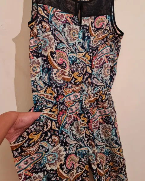 PALAZZO FRESCO ENTERIZO!! MIL ADORNOS!!. LINDO PALAZZO FRESCO ALGODON!! ESTAMPADO MIL ADORNOS GARIBOLEADOS!! MUY CASUAL Y SENSUAL ADORNO DE TRANPARENCIA NEGRA EN PECHO DE BLUSA/ BOLSAS SIMULADAS/ TALLA : M/L / ANCHO BUSTO: 54CM!! NUEVO!!