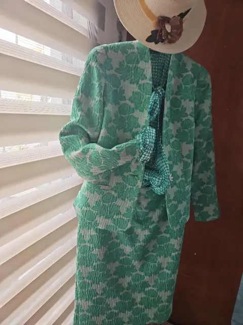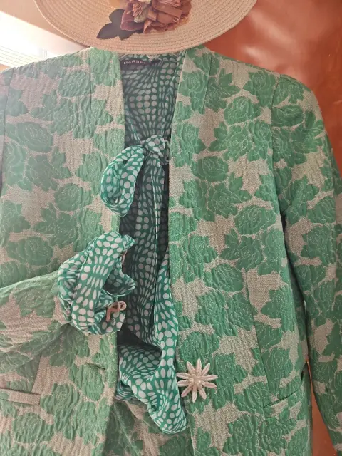 Traje sastre en verdes tela floreado en cobrarte con blusa punteada en blanco, personalizado. Falta tipo tubular, excepcional sincretismo . Sombrero opcional (preguntar)