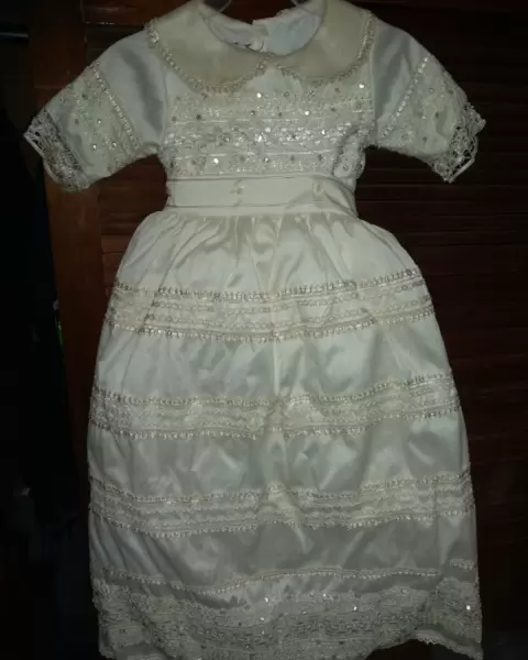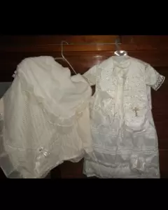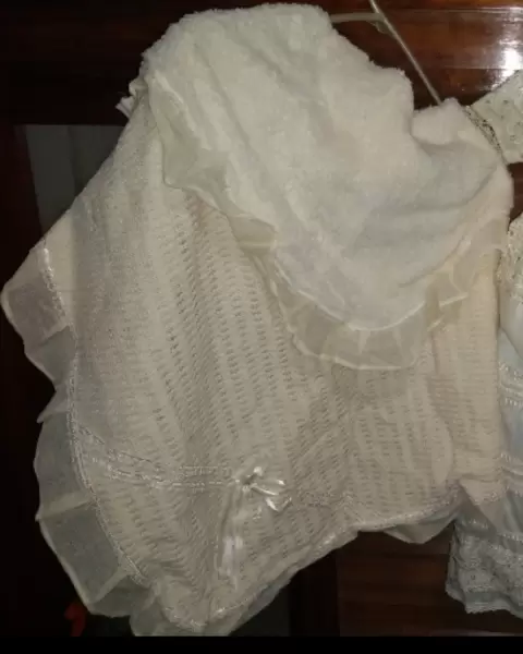 Ropón completo bordado (incluye vestido con faldon desmontable,gorro,zapatos de la misma tela)Tambien te incluyo una cobijita.Todo esta en perfecto estado.