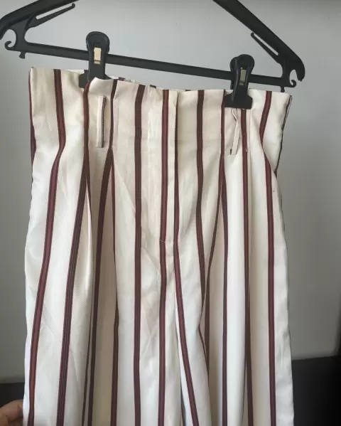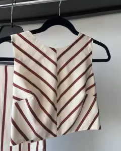 Conjunto pantalon y blusa, el pantalon es alto a la cintura, y es largo y ancho por lo que se ve muy bien con tacones altos, ideal para evento semiformal de día. La blusa es pegada sin mangas, la tela es ligera.