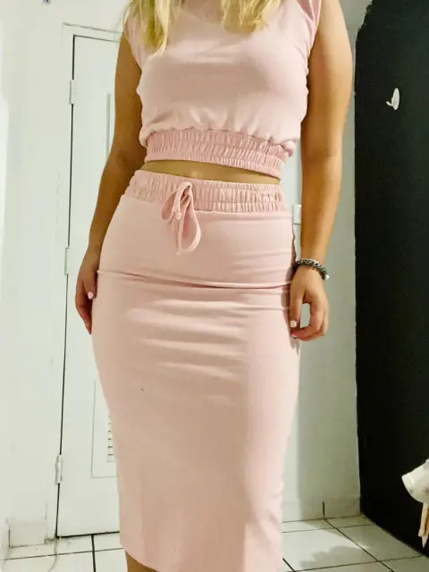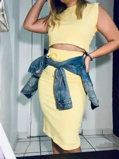 Sets falda y blusa. Sets sport falda lápiz con abertura parte de atrás, blusa corta con elástico. Tela tipo pants semi-stretch talla S/MColores rosa pastel y amarillo 💛💕