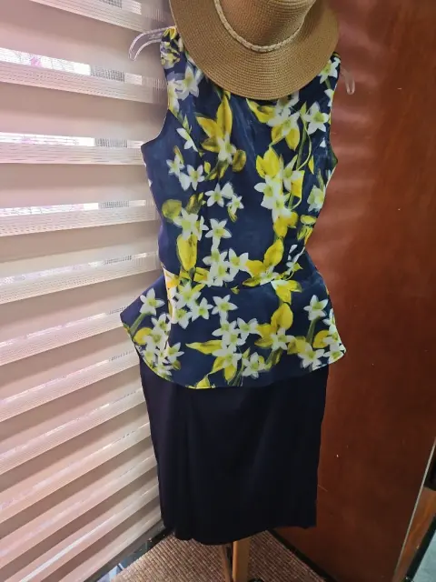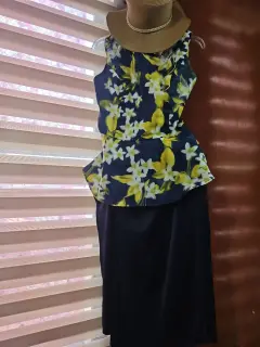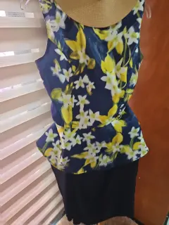 Sincretico azul y flores. Sincretismo en moda amarillo/azul. Distinción en el corte de la falda directa apertura, blusa sin mangas corte acentuado en cintura con olanes. Fresco para evento de día. Exquisita tela