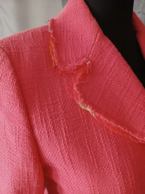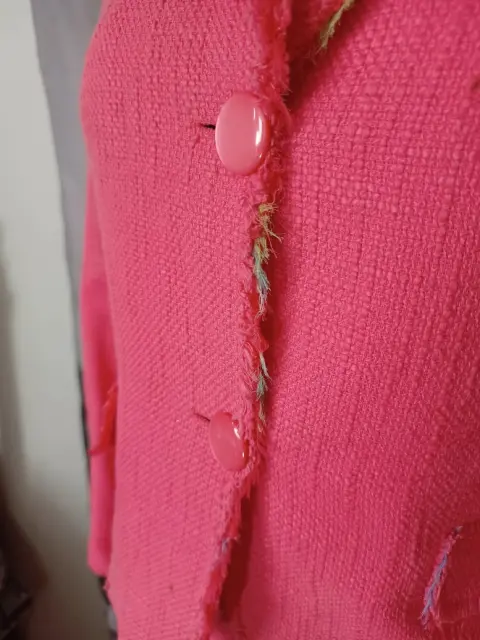 El saco tiene un adorno en la solapa deshilachado, el rosa está hermoso. La tela es fresca algodón, tipo bouclee.La falda es corta