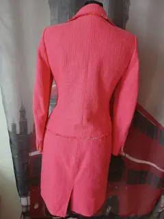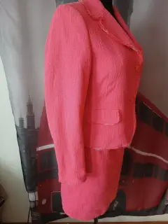 Traje sastre. El saco tiene un adorno en la solapa deshilachado, el rosa está hermoso. La tela es fresca algodón, tipo bouclee.La falda es corta