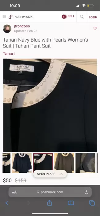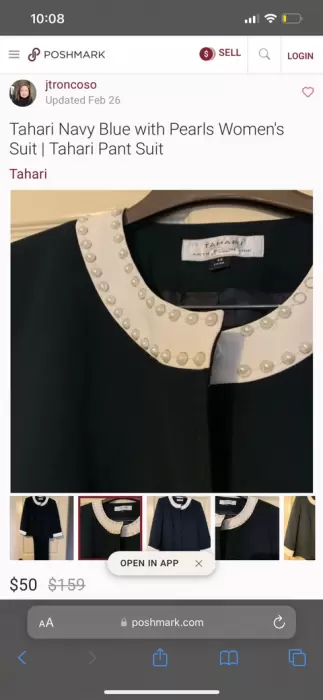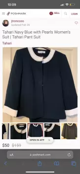 Traje sastre azul con perlas TAHARI. Traje sastre marca TAHARI azul marino saco con perlas en el cuello manga 3/4 pantalón recto a la cintura una prenda muy elegante para cualquier ocasión