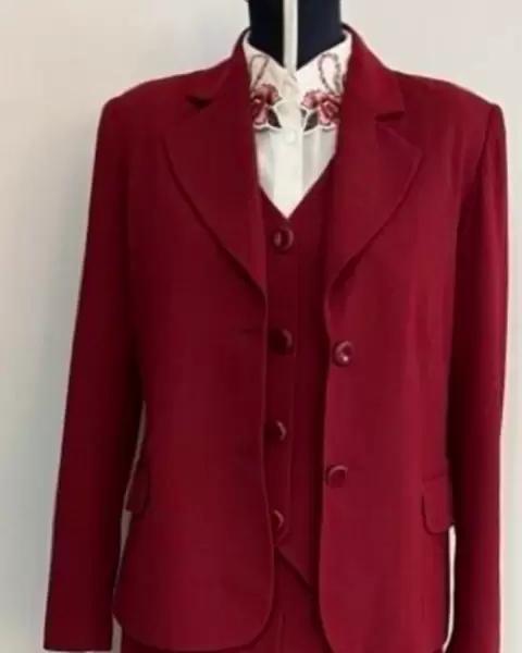 Traje Sastre Para Dama. Talla 9/32Rojo vinoCon forro.Marca: Karla D' LizMexicano. 3 piezas Saco, Chaleco y Pantalón. Medidas:Saco H a H 41 cm. A a A 53 cm. Largo 60.5 cm.Chaleco: A a A 51.5 cm. Largo 56 cm.Pantalón:Cintura 40.2 cm. Cadera 50.5 cm. Largo 1.04 cm.Por favor, resuelva sus dudas antes de ofertar por la prenda. Estoy para servirle, gracias.