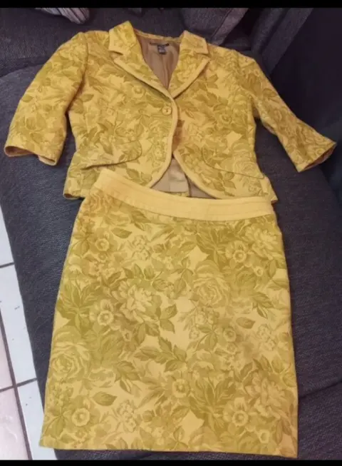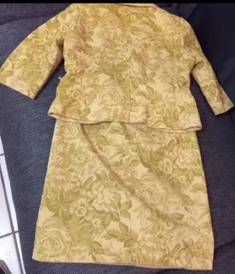 Traje sastre súper elegante y juvenil. Traje de blazer y falda hecho en España, en tonos verdes, juvenil, elegante, falda con abertura discreta en ambos laterales y cierre oculto lateral, blazer un botón al frente y bolsas simuladas