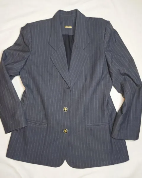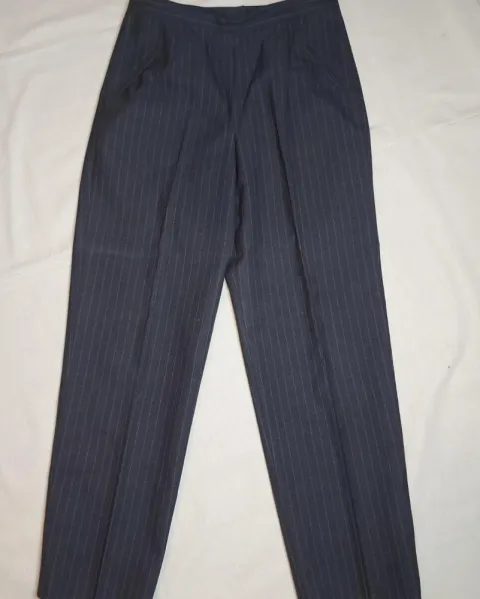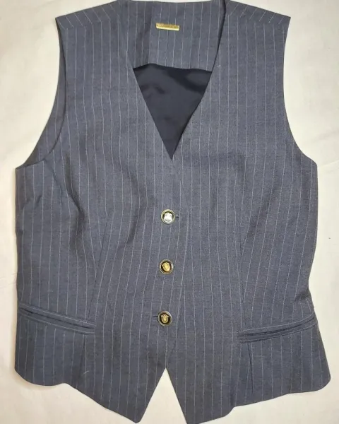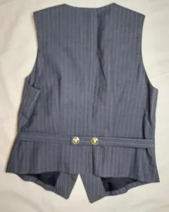 Traje sastre tres piezas gris. Traje sastre de casimir tres piezas, color gris oscuro con rayas tenues verticales.* El pantalón tiene el cierre atrás y simula tener bolsas, las medidas son:*Pantalón de cintura 39cm largo 1metro, cadera 48cm.*Chaleco de axila a axila 51cm*Saco de axila a axila 52cm y de hombro a hombro 41cm.Es 55% poliester y 45% lana. *Tiene en todas las piezas el mismo botón solo el pantalón no.