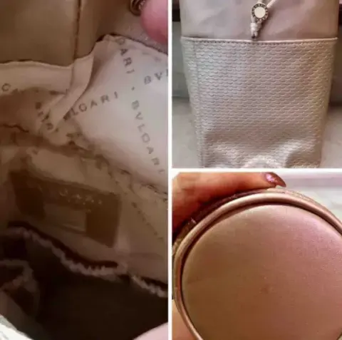 Cosmetiquera dorada Brillosa⭐️Broche dorado ajustable logo🌟#BVLGARI#Emirates✈️🇰🇼#firstclass😍Le cabe muchas cosas medidas 25 alto x18 ancho.En buenas condiciónes.Incluye la cremita🎀🤍