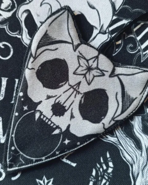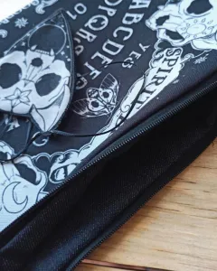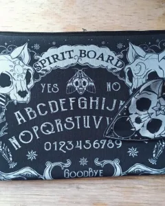 Cosmetiquera textil con estampado de Ouija, incluye un colgante de planchette, 31 x 16 cm.