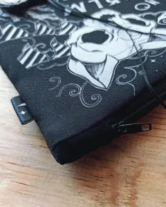 Cosmetiquera Ouija. Cosmetiquera textil con estampado de Ouija, incluye un colgante de planchette, 31 x 16 cm.