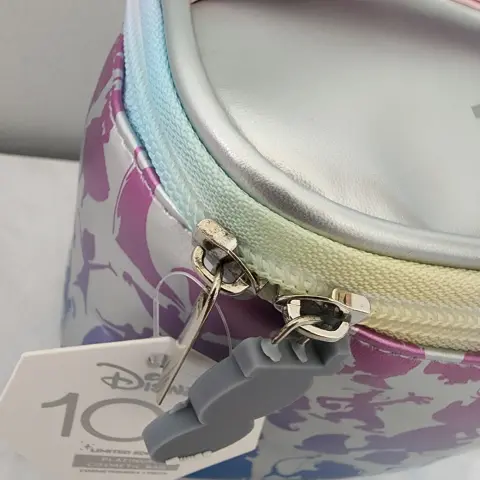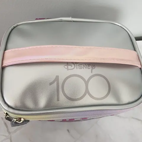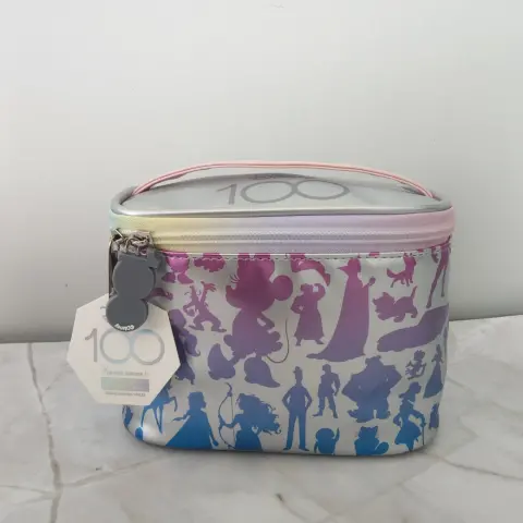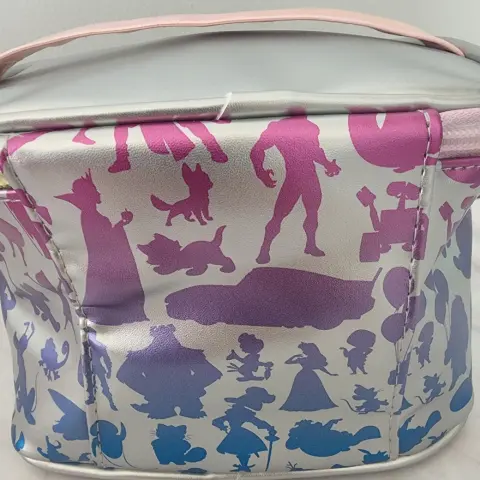 Cosmetiquera personajes de Disney.La cosmetiquera es plateada, con la.silueta de todos los personajes de Disney en tono azul, morado y rosa bitono.El cierre viene en varios colores y el strap es rosa claro.