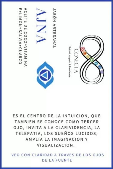 7 Jabones Artesanal Chakra Ajna con Cuarzos. Jabón: Chakra Ajna ó Tercer OjoSon jabones artesanales elaborados con la intención de equilibrar tus chakras mientras te consientes en la ducha cuidando tu piel, los cuarzos ayudan a equilibrar, limpiar, sanar y activar. Estos están elaborados de plantas medicinales como sábila, lavanda, manzanilla entre otras, además la aromaterapia tiene un sin fin de beneficios.