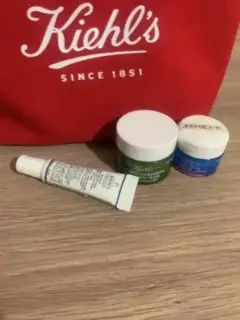 Cosmetiquera roja marca Kiehl’s con 3 minis: mascarilla de aguacate, crema ultra facialOil free y suero de retinol