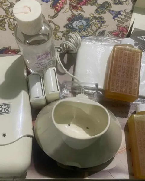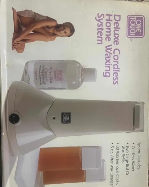 Depiladora de cera. Incluye 2 botellas de cera, 2 rodillos para aplicación de cera, bandas para depilación en cera, máquina para cera y calentador de cera.Tiene un detalle pero no afecta su uso.