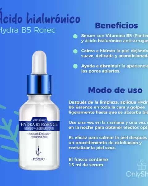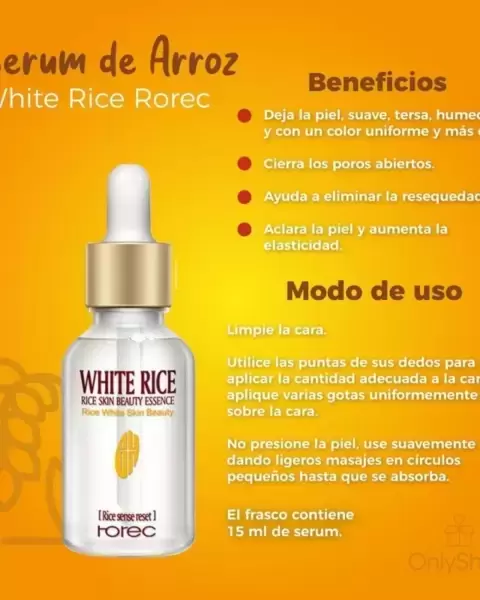 Ácido Hialurónico, ayuda a hidratar la piel. Sérum de Arroz. Ayuda a blanquear la piel. Es necesario usar bloqueador solar.