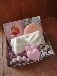 Caja con regalos para consentir a quien más quieres, cuenta con mascarillas, esponjas de limpieza facial, diadema de ducha, vela aromática, pinza para el cabello, y caja con listón lista para obsequiar