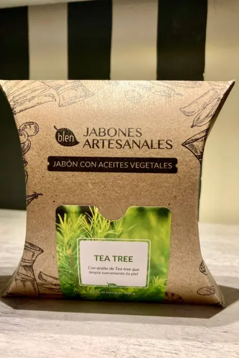 Jabón Artesanal Tea Tree Blen. Jabón facial antiséptico, personas con mezquinos o con heridas, personas con tendencia al acné (leve o moderado). Uso como jabón intimo (mujeres). Ayuda a tratar las infecciones en la piel acné, mezquinos o heridas y ayuda en el control de brillo facial. Auxiliar como jabón íntimo. Aplicar en rostro, cuerpo con un pequeño masaje en círculos hasta lograr hacer espuma, logrando un mejor beneficio. Aplicar las veces que sean necesarias.