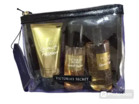 Kit edición especial Coconut Pasión Victoria's Secrets . Incluye bolsa cosmetiquera con cierre . 1 body Mist 75 ml coconut Pasión 1 gel shower corporal 89 ml1 crema locion corporal 75 ml Nueva con Etiqueta 🏷 Excelente para regalo .