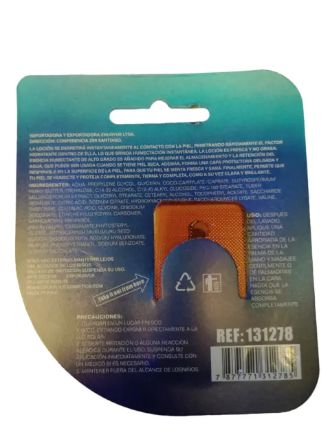 Loción hidratante y reparadora. La loción se derretira instantáneamente al contacto con la piel, penetrando rápidamente el factor hidratante dentro de ella, lo que brinda humectación instantánea, la loción es fresca y no grasa.La esencia humectante de alto grado es añadida para mejorar el almacenamiento y retención de agua, puede ser usada cuando se tiene piel seca, además, forma una capa protectora delgada y respirable en la superficie de la piel, para que tú piel se sienta fresca y sana, finalmente, permite que tú piel se humecte y proteja completamente, tierna y completa, como a su vez clara y brillante.Solo uso externo, mantener fuera del alcance de los niños.MODO DE USODespués del lavado, aplique una cantidad apropiada de la esencia en la palma de la mano y masajee gentilmente o de palmaditas en la cara hasta que la esencia se absorba completamente.