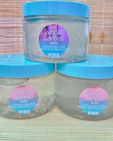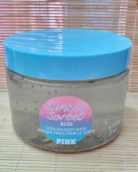 Mascarilla Corporal Aloe Vera. Mascarilla Corporal Sunset Sorbet Pink Victoria’s Secret Comodidad refrescante y muy ligera. Esta mascarilla corporal en gel te ofrece una piel besada por el sol que vuelve a brillar gracias al calmante y revitalizante aloe vera y el aroma tropical tan relajante. CÓMO USAR EL PRODUCTO: si quieres refrescarte después de tu sesión de sol, aplica una capa generosa del producto en la piel. Déjalo actuar de 5 a 10 minutos y enjuaga bien