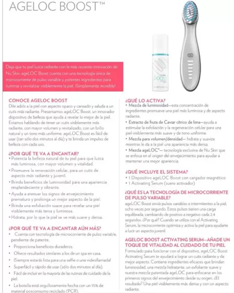 Nu skin AgeLOC Boost. El dispositivo de belleza que te deja la piel radiante (en solo 2 minutos)¡Así es!, ageLOC Boost de Nu Skin permite contrarrestar el ‘rostro cansado’, diciéndole adiós a la opacidad y resequedad que a veces es visible en nuestra cara. Es un dispositivo que cuenta con tecnología de microcorriente de pulso variable, algo en lo que vale la pena ahondar si quieres saber por qué es beneficiosa para la dermis.¿Qué es la tecnología de microcorriente de pulso variable y cómo funciona en mi piel?Como su nombre lo indica, son pulsos variables e intermitentes aplicados a la dermis en un promedio de ocho veces por segundo con una carga equilibrada, que cambia de positivo a negativo cada 2.4 segundos. Esta microcorriente activa y optimiza la piel, mientras le devuelve su aspecto lozano.Esta tecnología llevada al ageLOC Boost de Nu Skin promueve la renovación celular, atenúa los signos de envejecimiento prematuro, exfolia, hidrata y restaura su luminosidad. Esta funciona en conjunto con ageLOC Boost Activating Serum, un suero desarrollado con tecnología exclusiva de la marca, con el fin de que estos beneficios sean visibles desde las primeras aplicaciones.