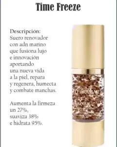Time Freeze sérum renovador. TIME FREEZE es un suero que fusiona lujo e innovación al combinar activos marinos que aportarán una nueva vida a tu piel. 😊¿Ya lo probaste?𝑻𝑰𝑴𝑬 𝑭𝑹𝑬𝑬𝒁𝑬 𝑺𝑬𝑹𝑼𝑴 𝑻𝑬𝑹𝑹𝑨𝑴𝑨𝑹 es un producto orgánico elaborado con ADN marino, células madre de algas y extracto de caviar en esferas, entre otros.¿ℚ𝕦é 𝕙𝕒𝕔𝕖?💦Repara y regenera la piel💦Humecta intensamente💦Combate Manchas💦Ayuda a aumentar la firmeza en la piel del rostro💦Da luminosidad💦Mejora el tono y elasticidad¡Olvidate de las demás cremas! con este nuevo TIME FREEZE SERUM.*ℂ𝔼𝕃𝕌𝕃𝔸𝕊 𝕄𝔸𝔻ℝ𝔼 𝔻𝔼 𝔸𝔻ℕ 𝕄𝔸ℝ𝕀ℕ𝕆 𝕐 ℂ𝔸𝕍𝕀𝔸ℝ*SOLO 2 proveedores en el mundo, de este extracto maravilloso, incrementa el número de células y estimulan la producción de colágeno y otros beneficios antioxidantes para la piel flacida en conjunto con un masaje Facial reafirmante, recuperas la firmeza de la piel entre 21 y 28 días lo que tardan las células en regenerarse. En SUIZA una inyección 💉 cuesta aproximadamente $10,000 usd, #TERRAMAR tiene el mismo activo en nuestro exquisito suero Time Frezze. ✨✨Testimonios reales de los resultados que dan nuestros productos anímate a probar los resultados son increíbles.✨✨