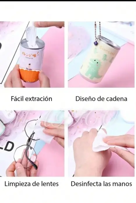 Toallitas Desinfectantes. Paquete de 12 toallitas húmedas desinfectantes, con figuras Kawaii en forma de 🥫 lata.Fácil y práctica de transportar.