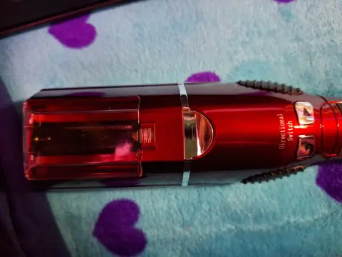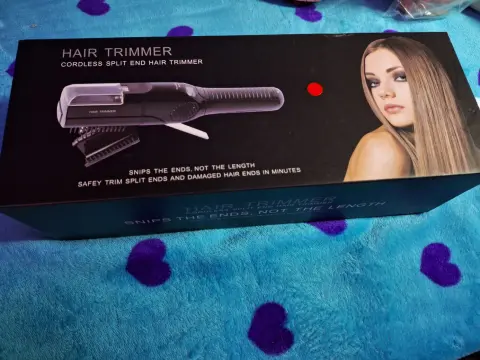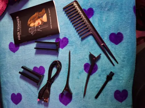 Tenaza para quitar la orzuelo del cabello. Es de color vino, viene con sus accesorios para usarla, trae su cable usb para recargarla, dos pinzas para el cabello, su Cepillo de limpieza, un peine y dos como clips 1ue se colocan dentro de la tenaza para medir el corte que deseas. Trae su instructivo y su caja. Esta prácticamente nueva, solo la use una vez