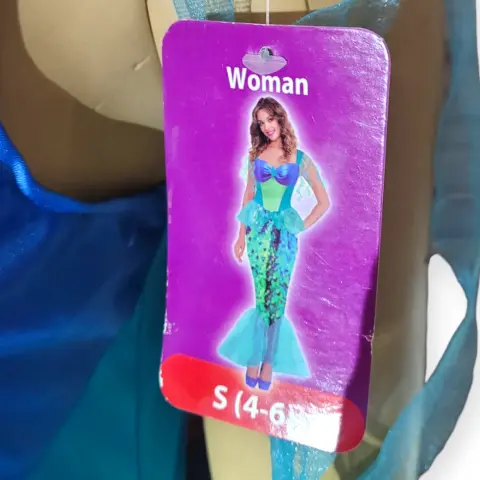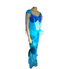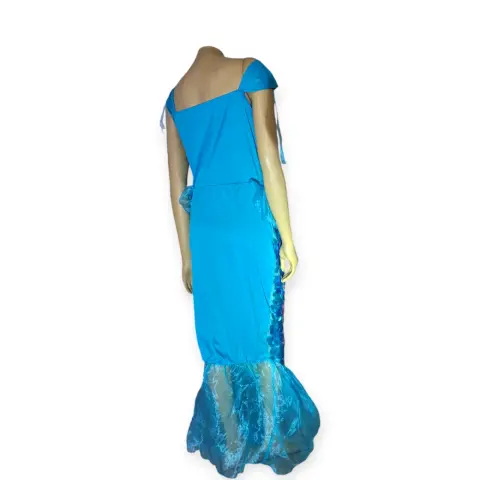 Disfras de Sirena para Halloween, talla chica, color azul cielo y oscuro, cuello de corazon, tirantes de espagueti, acento de escarcha, con tela transparente, hecho con mescla de telas y escarcha, nuevo a estrenar con etiqueta en buen estado cosmetico.