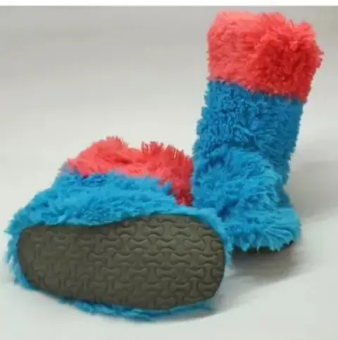 Disfraz monstruo lleva vestido azul con rosa y colores en el cuello, trae gorro de cabeza de monstruo con ojos y bufanda, trae tipo guantes con garras y botas de peluche.