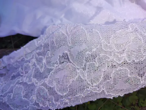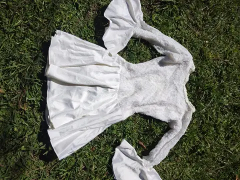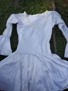 Leotardo brillante. Leotardo brillante en la parte de adel cuello tiene el borde con lentejuelas tornasol en la parte del pecho tiene encaje tornasol falda blanca aperlada tela licra poliester detalle pequeños de pluma