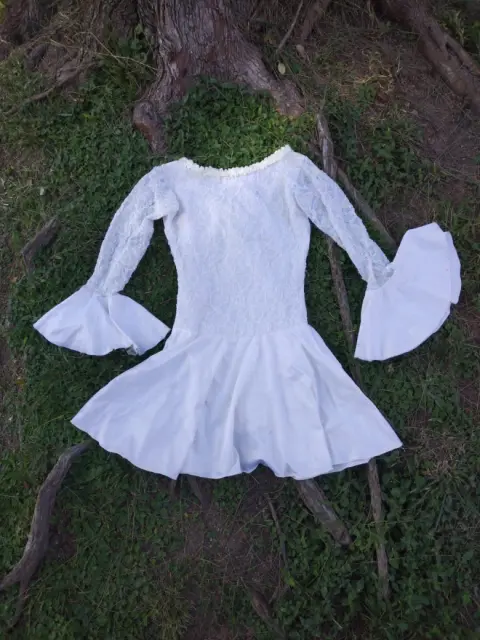Leotardo brillante en la parte de adel cuello tiene el borde con lentejuelas tornasol en la parte del pecho tiene encaje tornasol falda blanca aperlada tela licra poliester detalle pequeños de pluma