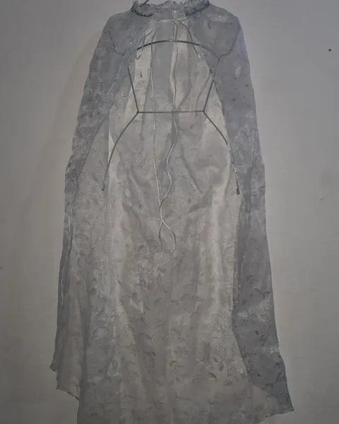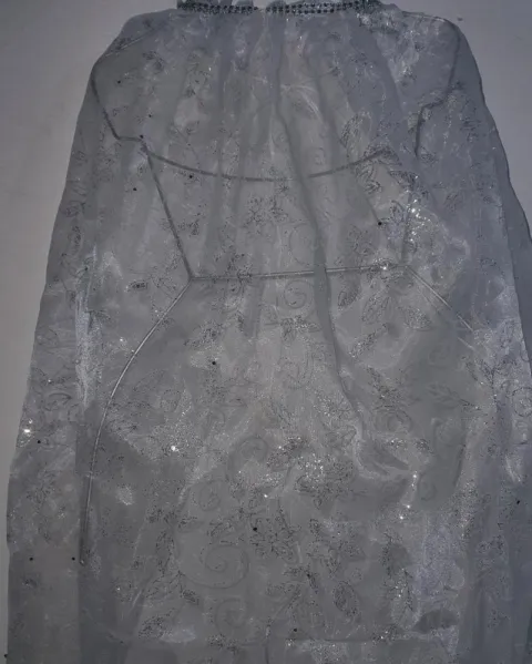 Para 9 u 11años, 4 piezas (capa, vestido superior con corsell, falda inferior, creolina de tela).Tela gruesa y resistente con varias capas y brillos.