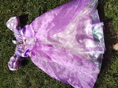 Vestido de rapunzel. Vestido de la princesa rapunzel color morado con rosa en la parte del pecho tiene una caja con música de la princesa y en la parte de la falda tiene el diseño de la torre con brillos y la falda es color tornasol.