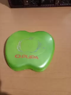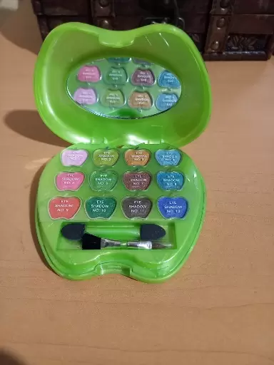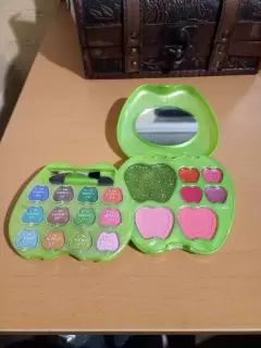 Estuche cosmético forma de manzana verde. Contiene 12:tonos de sombras , 4kabiales, dos rumores espejo y aus aplicadores.