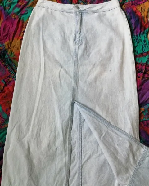 3Pack 2 faldas larga de mezclilla y 1 culotte. 2 faldas de mezclilla largas talla M la clara tiene una manchita tipo salsa =/ en la parte frontal largo 80, falda obscura abierta de ambos lados simula tmb a pantalón largo 100 cm pantalon tipo culotte o pareo tiras ajustables queda desde S-Xl =) valen la pena!!