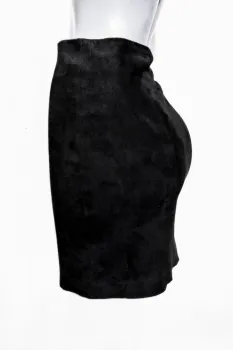COLOR NEGRO, GAMUZA CON TEXTURA, 100% PIEL, CON FORRO, TALLA CHICA, MEDIDAS DE UNA CARA DE LA PRENDA: CINTURA 37 CM, CADERA 42 CM, LARGO 45 CM.