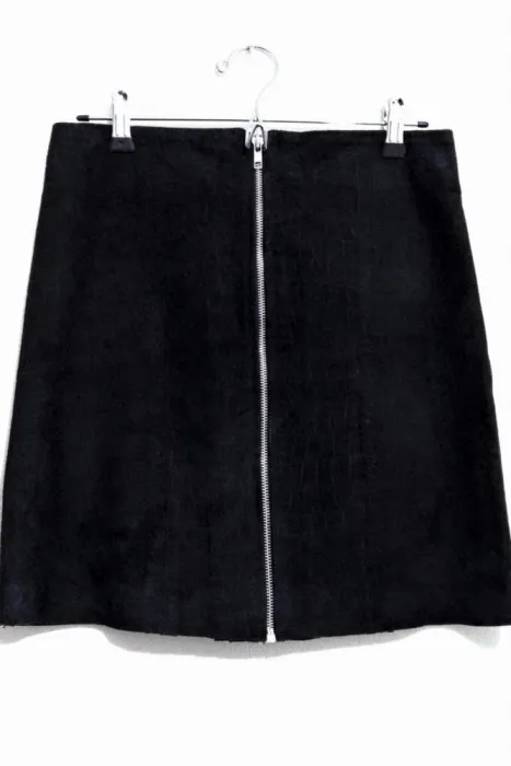 FALDA 100% PIEL ZINTY CHICA. COLOR NEGRO, GAMUZA CON TEXTURA, 100% PIEL, CON FORRO, TALLA CHICA, MEDIDAS DE UNA CARA DE LA PRENDA: CINTURA 37 CM, CADERA 42 CM, LARGO 45 CM.