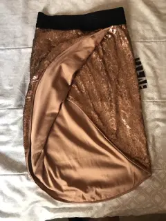 Falda de lentejuelas doradas, con elástico en la cintura más corta de enfrente y con abertura por delante y unas pequeñas pinzas enfrente.