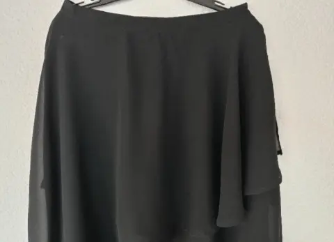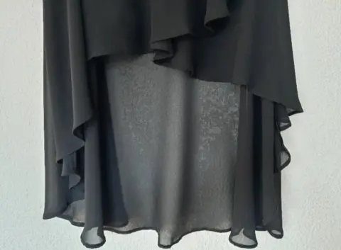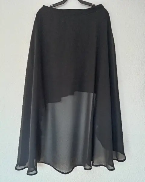 Falda a capas de talle bajo, color negro, falda corta delantera y larga por la parte de atrás.