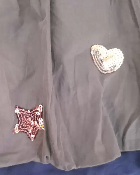 Falda aglobada niña 12 lentejuela - kids. Falda aglobada gris oscuro para niña, talla 12, con aplicaciones de lentejuela rosa y plateada ( estrella y corazón), elástico negro en la cintura,sin detalles