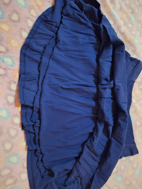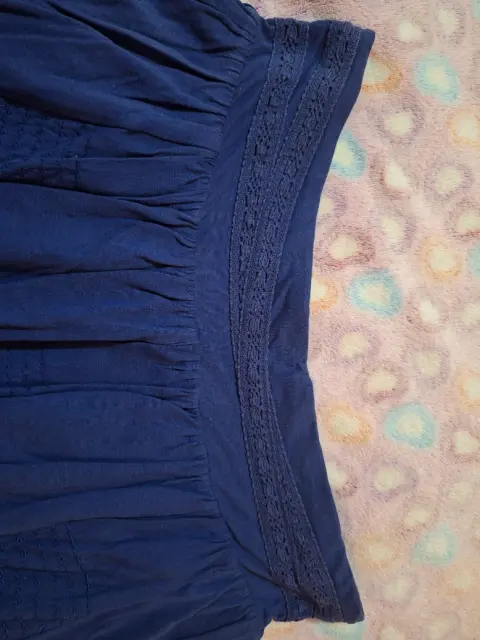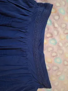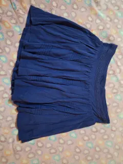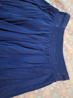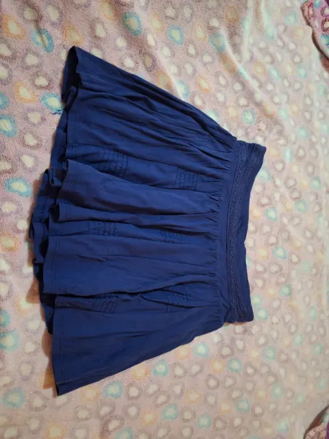 Hermosa mini falda color azul marino. Tiene algo de vuelo, con forro. En la parte de la cintura por atrás trae resorte para que se acomode a tu figura. Por enfrente en la pretina tiene detalles con encaje muy lindos. La tela de la falda no es lisa, en algunos lados trae detalles de costura muy lindos.Es talla 28 pero con el resote puede quedar hasta una 32