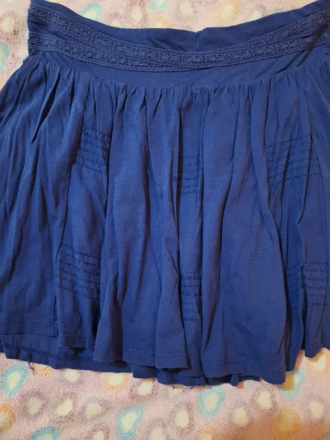 Falda azul marino con vuelo. Hermosa mini falda color azul marino. Tiene algo de vuelo, con forro. En la parte de la cintura por atrás trae resorte para que se acomode a tu figura. Por enfrente en la pretina tiene detalles con encaje muy lindos. La tela de la falda no es lisa, en algunos lados trae detalles de costura muy lindos.Es talla 28 pero con el resote puede quedar hasta una 32