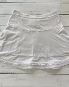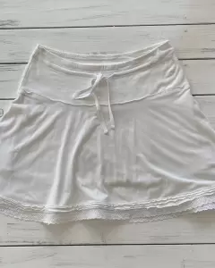 Falda blanca de algodón con forro y jareta para ajustar. Es stretch. Las medidas se tomaron sin estirar. Tiene detalles que se ven en la ultima foto. Talla: XS Medidas: 36 cm cintura, 44 cm de cadera y 43 cm de largo.