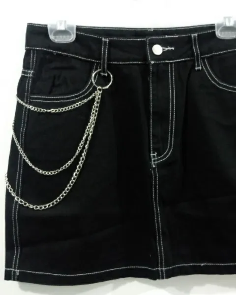 Falda cadena Shein. Minifalda de mezclilla negra con costuras blancas, botón, cierre y bolsillos traseros. Talla L pero viene reducido a M. La cadena puede quitarse. Queda bien a una talla 9 mex.