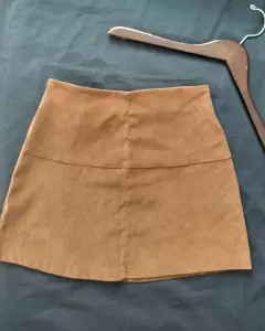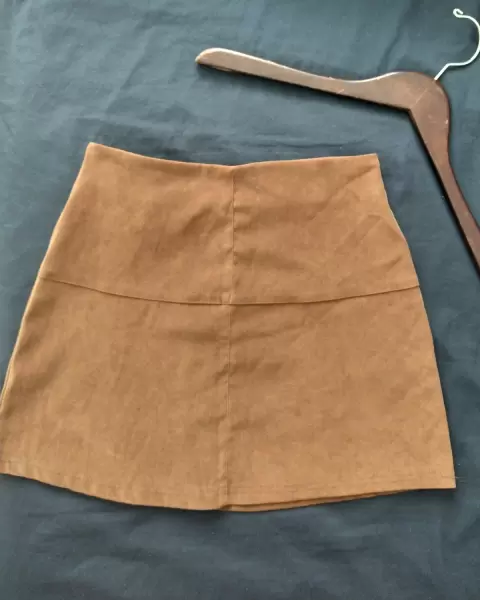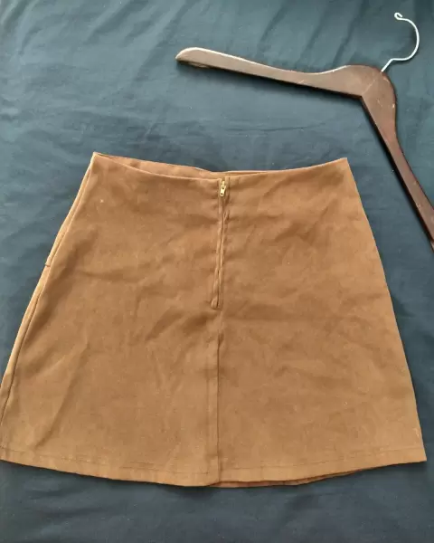 Falda Café Caqui medio Oscuro marca Spiceweare, talla Small/chica 96% poliéster 4% spandex con textura similar a la gamuza, muy bonita sin detalles, sin enmendaduras ni decoloración no se transparenta. El cierre funciona perfectamente, está en excelentes condiciones.