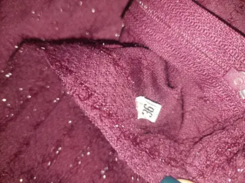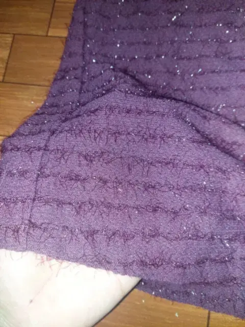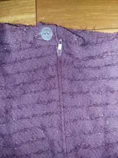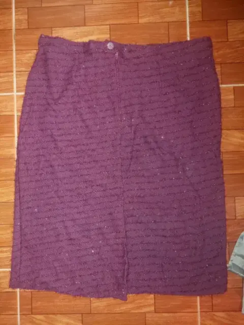Falda color uva. Falda en corte recta, la tela es elástica y trae textura como pelitos qué hacen qué también brille, es TALLA 36 de largo llega aprox a la rodilla
